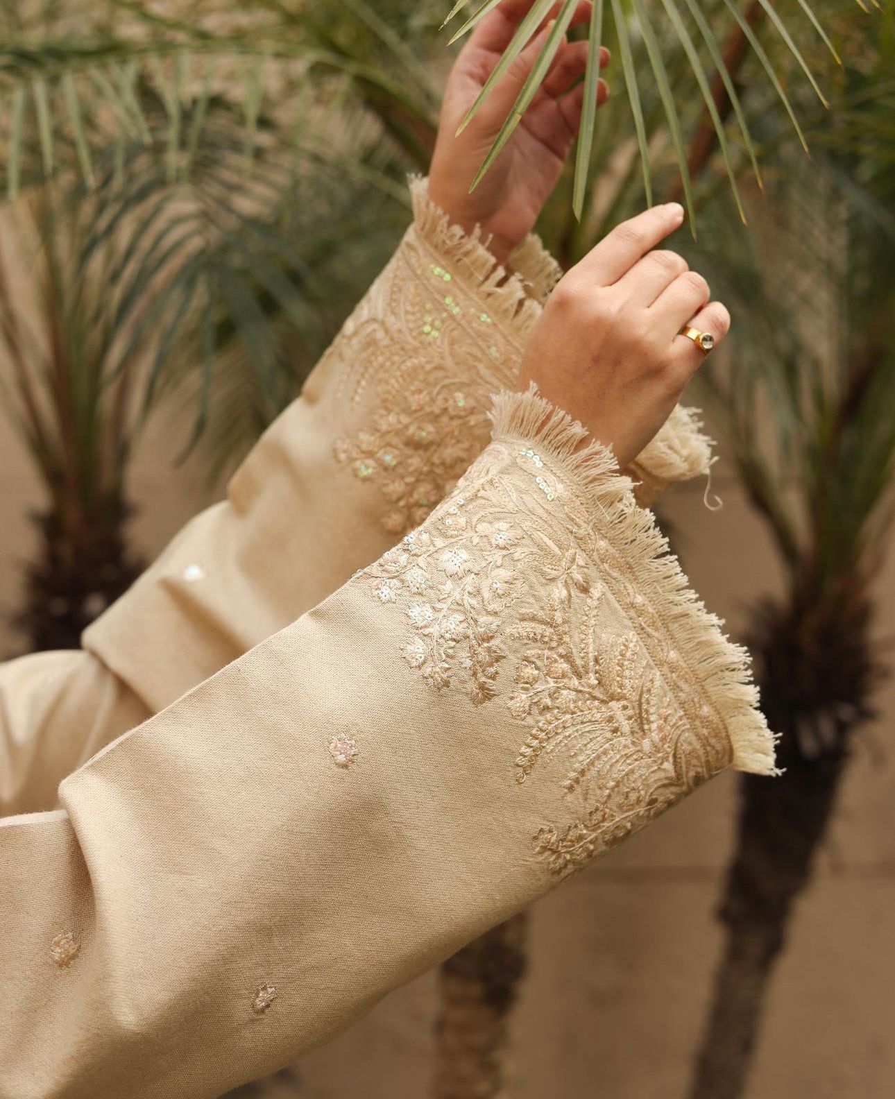 - Bottom: Coordinated satin trousers adorned with delicate embroidered borders, completing the look with subtle elegance.